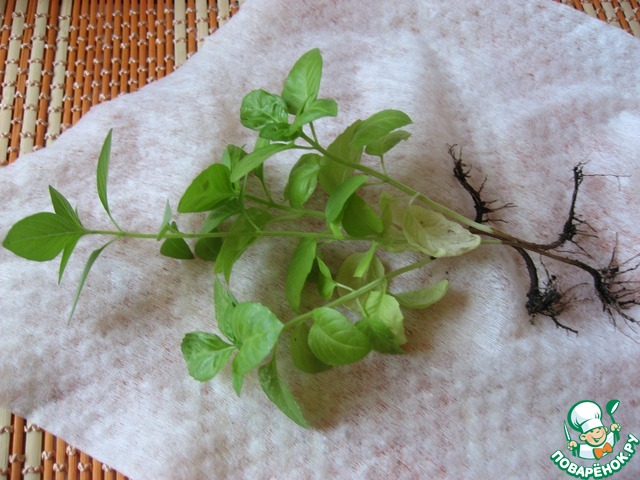 Это мой домашний базилик. Он растёт на балконе. С него возьму только листочки и верхнюю частей стеблей, т. к. они нежнее и ароматнее.