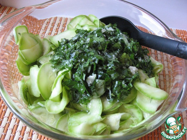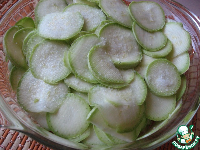 Пока кабачки маринуются, за это время перемешиваем их пару раз.