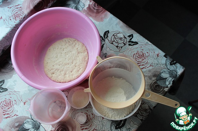 Просеять муку, тщательно вымесить и оставить бродить в теплом месте на 3-4 часа.