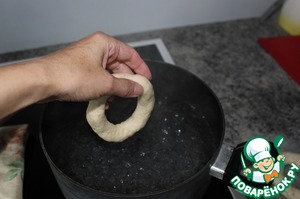 В кипящую воду опустить бублик секунд на пять - семь, в процессе купания перевернуть.