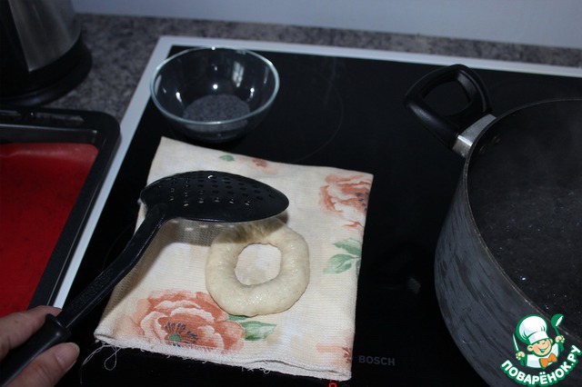 Посыпать влажный бублик маком и выложить на застеленный силиконовым ковриком противень.