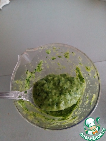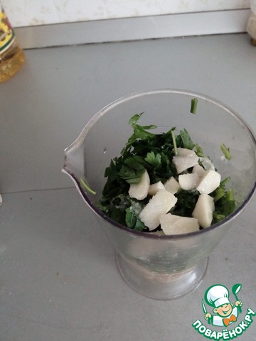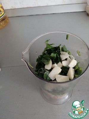 Туда же отправляем чеснок, воду, масло, петрушку и соль. Все тщательно измельчаем.