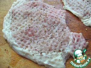 Свинину хорошо отбить, надрезать края, чтобы мясо при жарке не скручивалось. Совсем слегка посолить и поперчить.