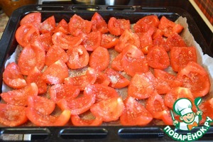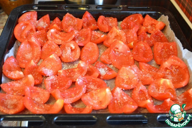 Помидоры разрежьте на 4 части, удалите семена. Противень застелите бумагой для выпечки, выложите на него дольки помидоров, посыпьте солью