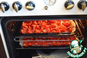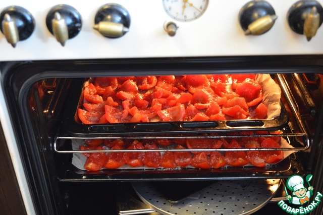 Духовку нагрейте до самой максимальной температуры (у меня это 250 градусов). Запекайте помидоры около 10-15 минут. Духовки у всех разные, поэтому следите внимательно, помидоры должны стать мягкими и у них могут слегка подпалиться края, это нормально