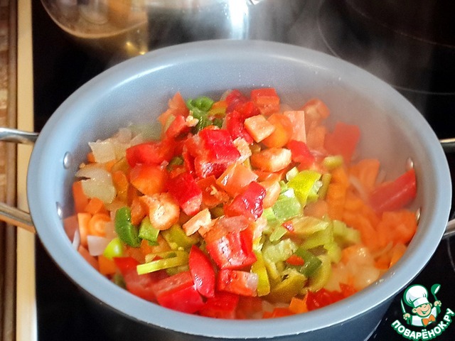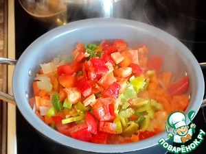 Добавьте к овощам и обжаривайте на сильном огне еще 10 минут, переложите в другую кастрюлю