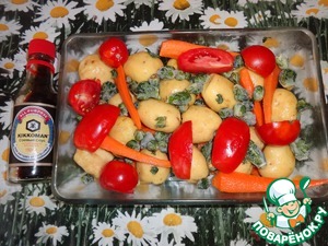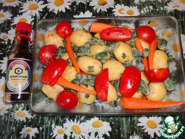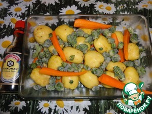Овощи уложить в блюдо для запекания, а сверху фаршированного карпа. Поставить в духовку на 50 мин. при 180-200 гр.