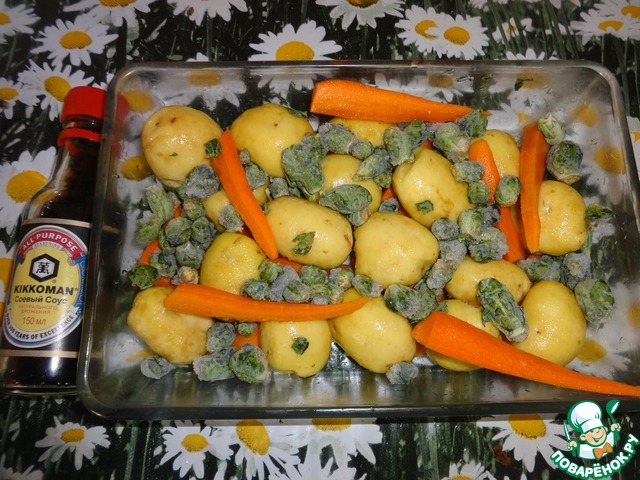 Картошку молодую мелкую помыть и почистить. Морковь почистить и нарезать на части. Добавить брюссельскую капусту.