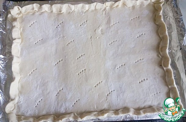Слоеное тесто разморозить. Раскатать, придав форму прямоугольника.