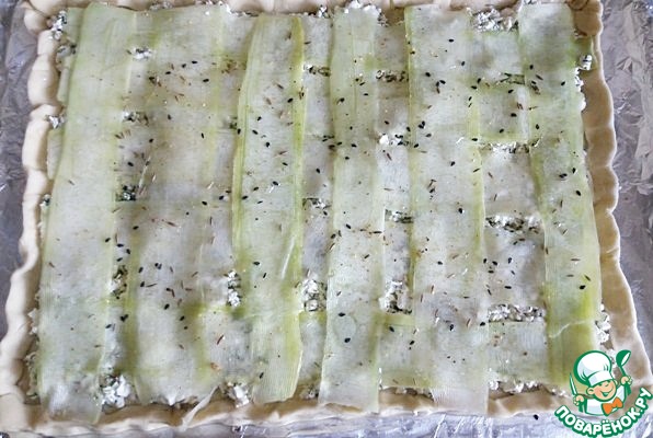 Кабачок порезать на тонкие полоски. Лучше всего это делать специальной чисткой. Выложить поверх сыра в виде переплета (или как угодно). Немного сверху кабачки присолить, взбрызнуть растительным маслом и посыпать тмином.