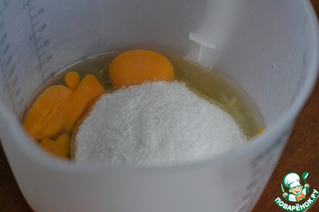 В отдельной миске взбить яйца, желтки, сахар и крахмал