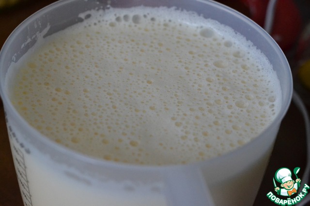 Вливаем частями горячие сливки во взбитую яичную смесь постоянно взбивая.