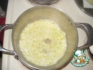 В кастрюле с твердым (двойным) дном растопить сливочное масло, добавить растительное, добавить лавровый лист, лук и чеснок. Пропассеровать лук и чеснок до прозрачности лука. Ни лук, ни чеснок не должны зарумяниться, иначе вкус супа будет уже не тот.