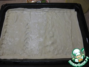 Пока начинка немного остывает, в это время выкладываем на противень листы теста, немного внахлест, создавая швы и небольшие бортики по краям, примерно так)