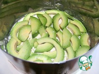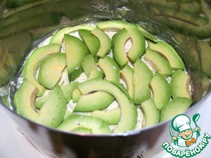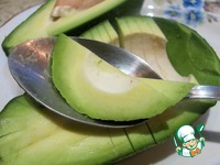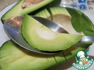 Нарезать авокадо пластинками и вынуть ложкой, освободив от корки. -