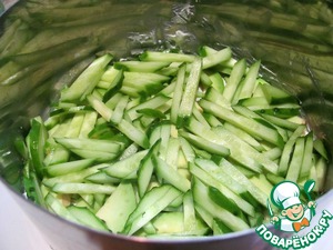 Приготовить заправку. Смешать уксус, сахар или сахарную пудру, соль. Поставить на огонь и греть, помешивая, до полного растворения соли (сахара). Не кипятить.
