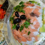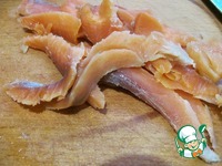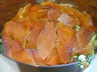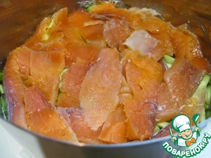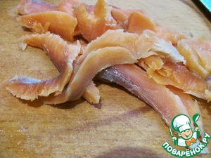 - Рыба (малосольная или копченая форель, лосось, семга, горбуша) — 120 г