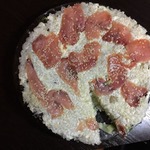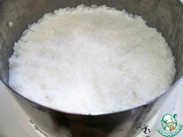 Одну треть риса выложить в кольцо и разровнять влажными руками. Хорошо уплотнить.
