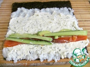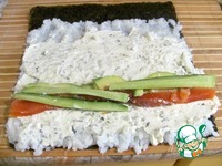 Из оставшихся продуктов скрутить ролл, нарезать.