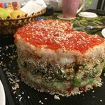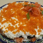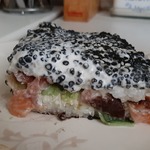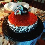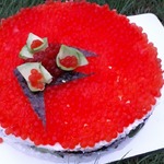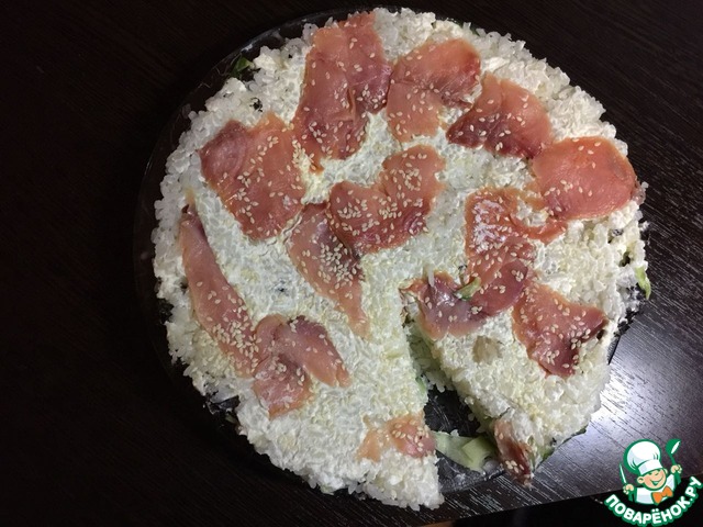 Поставить суши - торт в кольце в холодильник на пару часов. Достать, освободить от кольца. Украсить роллами. Бока посыпать кунжутом. Подавать с соевым соусом.