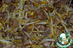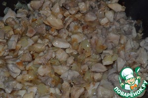 Добавить к луку куриное филе, нарезанное кубиком, перемешать и жарить 5 мин. на среднем огне.