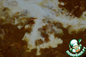 За 10 мин. влить сметанно-мучную смесь в сотейник с мясом и овощами и перемешать.