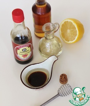 Приготовить заправку, в чашке смешать соевый соус Kikkoman, лимонный сок, уксус, растительное масло.