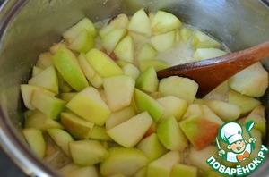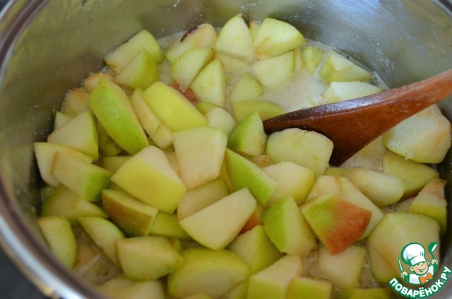Вскипятить воду, проварить яблоки с корицей, имбирем, коньяком и 3 ст. л. сахара, 5 минут.