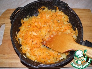 Морковь натираем, лук мелко режем, обжариваем как обычно с растительным маслом на сковороде