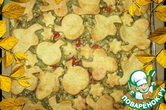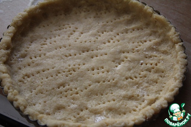 Тесто выложить в форму (диаметр 23 см) и сделать невысокие бортики. Наколоть часто вилкой и выпекать основу при 180 градусах около 30 минут.