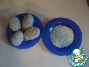 • Из мяса, кабачка, 1/2 луковицы, яблока делаем фарш. Формуем биточки и панируем их.