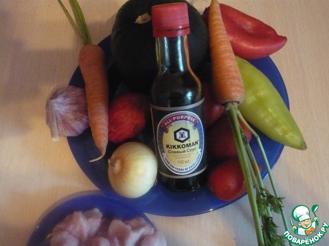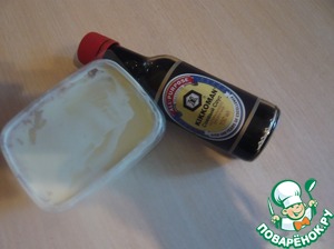 • Делаем соус. Сметану смешиваем с совевым соусом +100мл. воды.