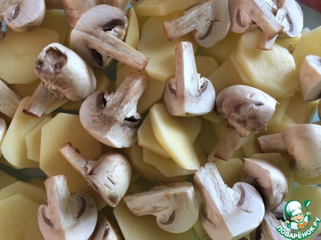 Картофель нарезать тонкими пластинами, шампиньоны - четвертинками, уложить в жаропрочную форму.