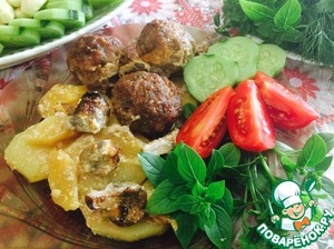 Фарш посолить и поперчить по вкусу, по желанию можно добавить лук, чеснок, зелень. Скатать мясные шарики и выложить на картофель. Запекать в духовом шкафу 50-60 минут при температуре 200 градусов.