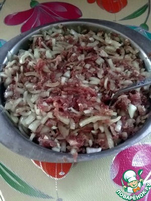 В это время делаем начинку. Добавляем в фарш нарезанный лук, соль, перец и масло. Все хорошо перемешиваем.