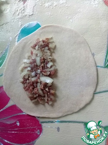 Отщипываем от теста кусочек и тонко раскатываем. Затем на одну сторону кладем фарш.