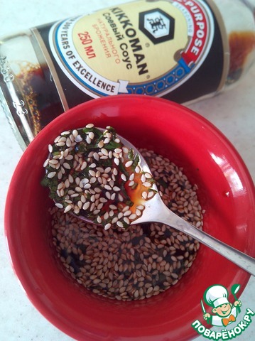 В соевый соус Kikkoman добавить семена кунжута и мелко нарезанную зелень, перемешать -