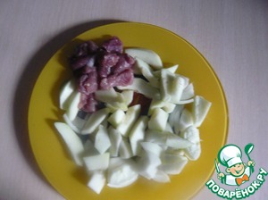 Делаем фарш. Мясо, яблоко, кабачок и сыр (яблоко и кабачок добавляем по вкусу, кому как больше нравится - больше мяса или больше овощей) прокручиваем на мясорубке или в блендере. Немного посолим.