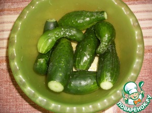Огурцы тщательно вымыть холодной водой. Если на огурцах есть хоть малейшие повреждения, зачистить их. Срезать у огурцов кончики. Как видите, в дело у меня идут огурцы разной формы, и "некондиционные" тоже. Но я всегда делаю баночку-другую "парадных" огурчиков, если они есть, конечно)