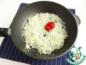 Солю лук по вкусу, добавляю томатную пасту.