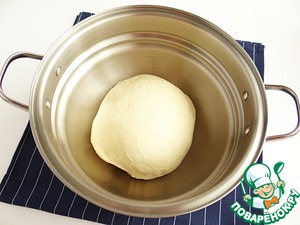 Тщательно замешиваю тесто, которое должно получится мягким, не липнуть к рукам. Накрываю тесто пленкой и даю ему увеличиться в размере.