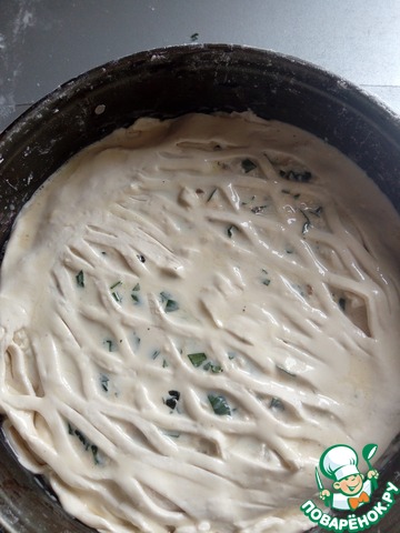 Тесто размораживаем раскатываем, оставляем не много для верхушки пирога. Остальное тесто выкладываем в форму для запекания, подпыленную мукой. На тесто выкладывакм пассированный лук.