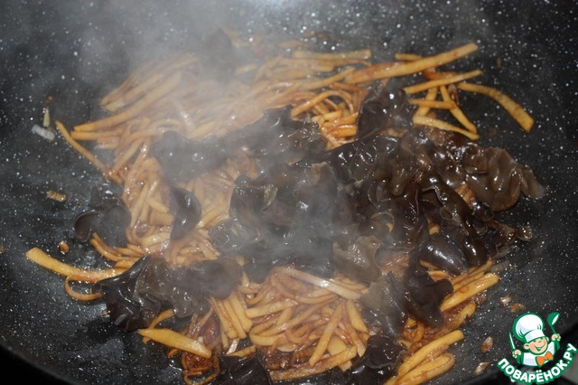 Первым делом надо восстановить сушеные древесные грибы. Замочить грибы в теплой воде (около 40 градусов) на 1 час. Промыть в проточной воде. Залить холодной водой и поставить в холодильник на несколько часов (можно на ночь). Это самый правильный способ восстановления сухих древесных грибов, но китайцы часто просто держат час в теплой воде, промывают и сразу готовят.