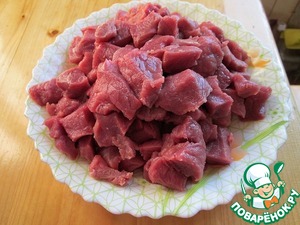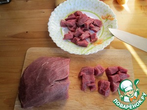 Пока он тает и закипает режем мясо, говядину. Для «летнего» берем постную говядину, вообще без жира, что б холодный супчик был вкусен. Режем не крупно, чуть мельче чем на гуляш.