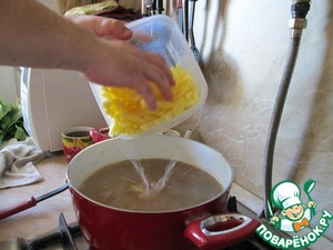 Ну пока режем бульон закипел. Отправляем в него мясо.