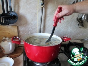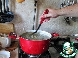 Снимаем пенку, ее очень мало, так как бульон готов и отфильтрован при приготовлении а постное мясо пенку почти не дает, то что на фото это вся пенка.