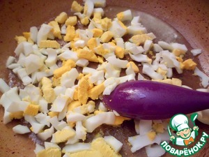 В сковороду выложить сливочное масло и рубленные вареные куриные яйца.