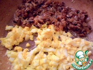 Перемешать яйца и сразу выложить к ним обжаренные грибы с луком.