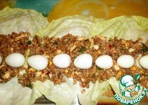 Листья капусты разложить на столе внахлест. У меня получилось 80см в длину. На них разложить начинку из гречки с грибами.