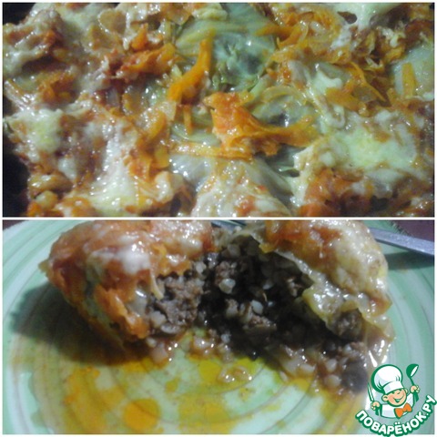 Переложить на смазанный противень, сверху залить подливой. Налить стакан кипяченой воды в противень, накрыть фольгой и поставить в духовку 180°C на 50-60 минут. Смотреть по капусте.